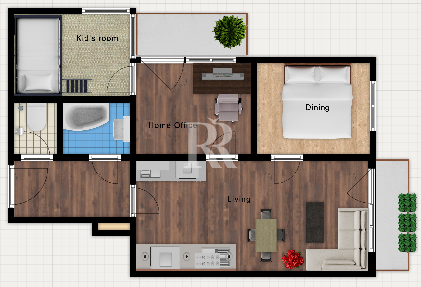 Dispozice bytu: Vstupní chodba, obývací pokoj propojený s kuchyní, ložnice, pracovna, dětský pokoj, koupelna, WC.