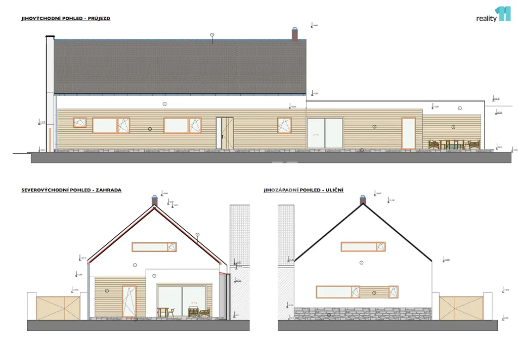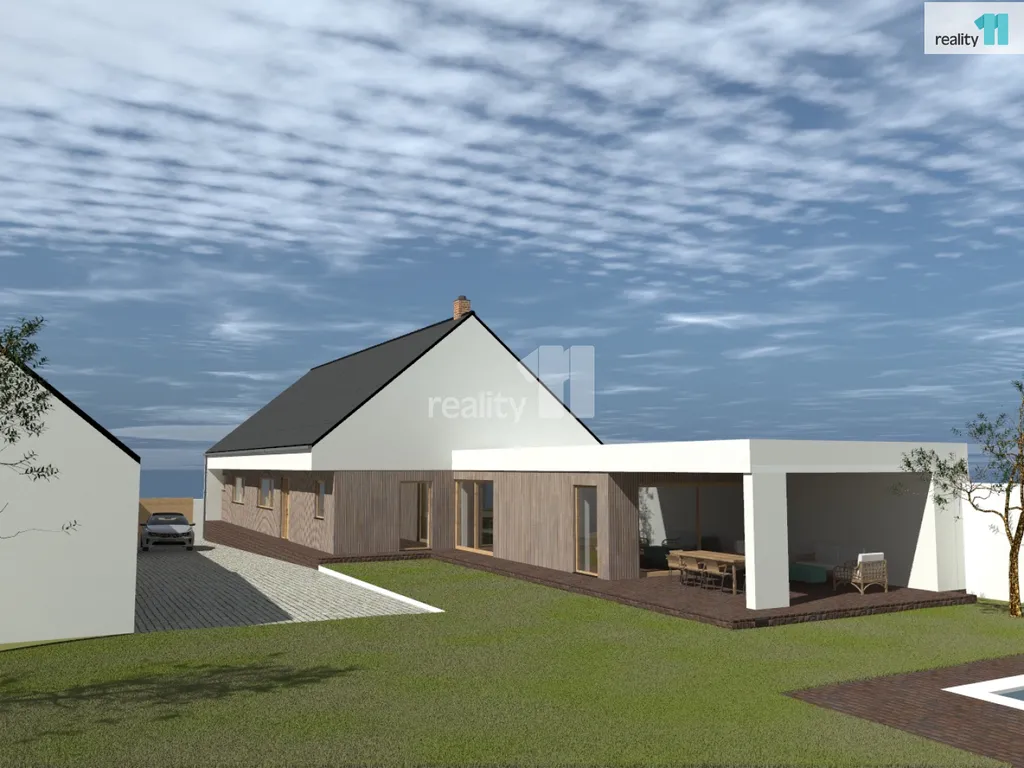 Dispozice domu: Obývací pokoj s kuchyňským koutem (70 m²) – dominantní prostor domu s možností instalace krbových kamen, přímý vstup na terasu a zahradu, ložnice (15 m²) se samostatnou šatnou, další 2 pokoje (každý 14 m²) – vhodné jako dětské pokoje, pracovna (9 m²) – ideální pro práci z domova, dvě koupelny (12 m² a 8 m²) a samostatné WC, technická místnost, spíž, chodba a několik šaten pro maximální komfort a úložný prostor. Dům bude díky promyšlené dispozici vyhovovat i náročnější rodině s dětmi. Technické řešení: Zdivo - Porotherm se zateplením minerální vatou 20 cm, Střecha: sedlový krov, pálená krytina Tondach v barvě antracit, Okna: plastohliníková, trojskla, Vytápění: tepelné čerpadlo vzduch–voda s podlahovým topením + krbová kamna v obývacím pokoji, Ohřev TUV: zásobník napojený na tepelné čerpadlo, Větrání: rekuperační jednotka s účinností minimálně 85 %. Energetická náročnost: projekt splňuje normy pro úsporné domy (ČSN 73 0540). Celková plocha pozemku: 1 023 m².