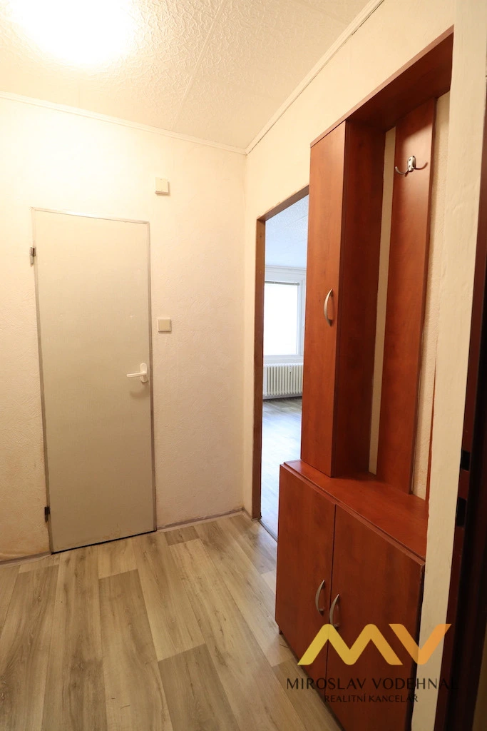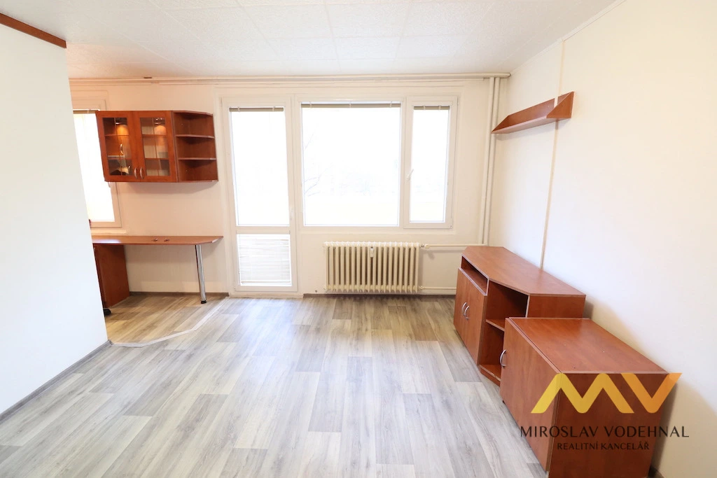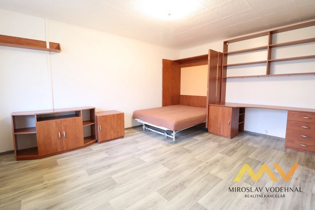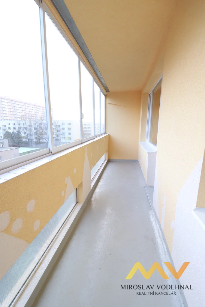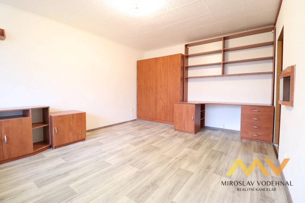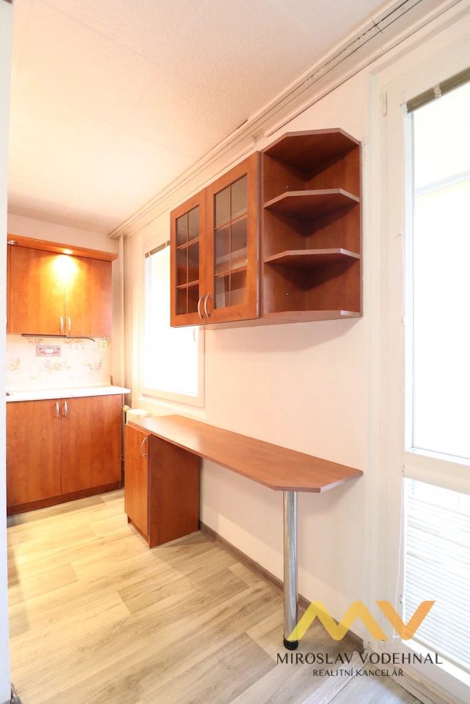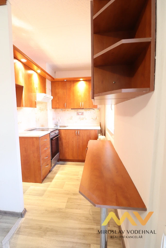 Pěkný, velice udržovaný, čistý a útulný byt s odděleným kuchyňským koutem vybavený pěknou kuchyňskou linkou s el. sporákem, jídelním barovým stolem. V obývacím pokoji pracovní stůl, vyklápěcí dvoulůžko. Bytové jádro je umakartové, koupelna je se sprchovým koutem (minivana), WC. V předsíni vestavěné skříně. Podlahová krytina PVC. K bytu náleží na patře umístěná komora s regály nahrazující sklep (vhodné i pro kolo), v domě kolárna. K bytu náleží prostorná zasklená lodžie 7 m2. Parkování volné před domem bez poplatku, MHD, plná občanská vybavenost, v okolí domu zeleň.