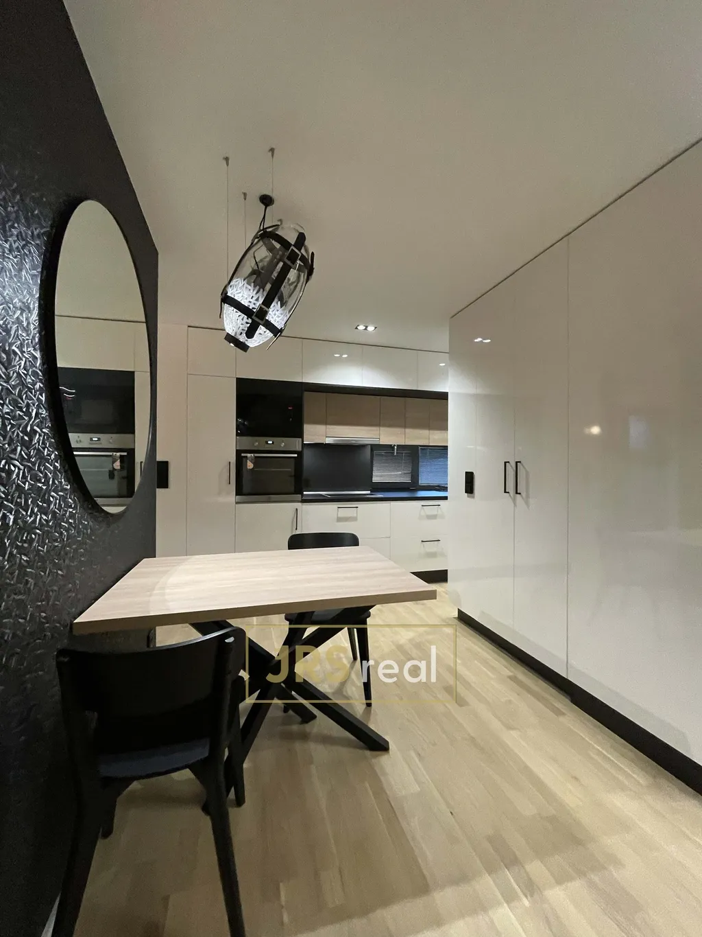 V celém bytě je vestavěný nábytek na míru, který byl promyšleně umístěn tak, aby co nejlépe využil každý volný kout v bytě. Skříně, police a úložné prostory jsou elegantně začleněny do interiéru a doplňují celkový moderní vzhled.