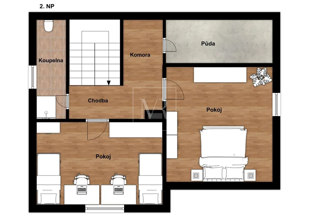 Patro: dva pokoje, koupelna s wc a menší půdička
