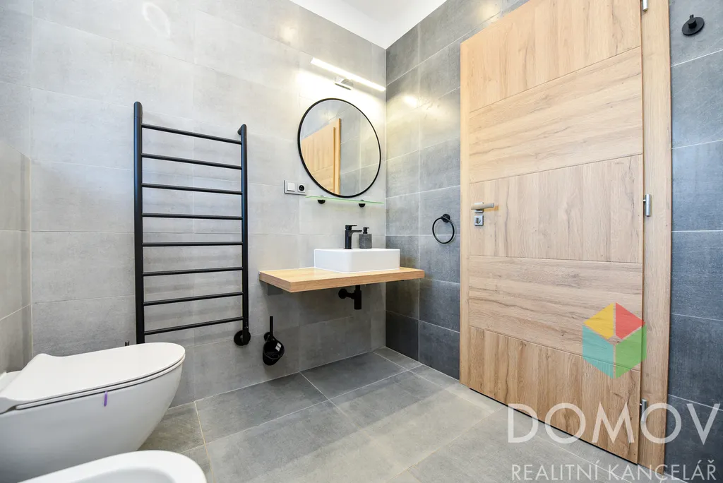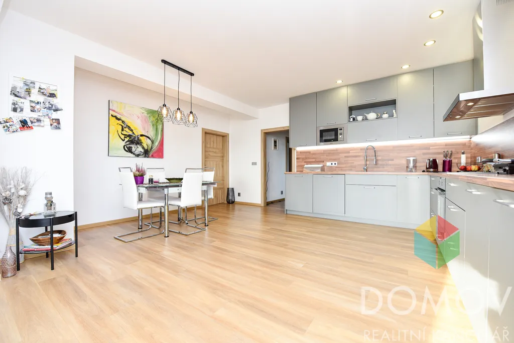 Byt je vybaven ve vysokém standardu, je zde kuchyňská linka s kvalitními spotřebiči (myčka, varná deska, vestavná trouba, mikrovlnná trouba, lednice, digestoř), hliníková okna, vinylová podlaha v dekoru parket. V bytě je podlahové topení. Velmi příjemným benefitem této nemovitosti je prostorná terasa (15 m2), na kterou se dostanete posuvnými dveřmi z obývacího pokoje i z ložnice. V koupelně vana, umyvadlo, WC. V bytě je také praktická technická místnost s pračkou s integrovanou sušičkou prádla. Ke vstupním dveřím domu je z ulice potřeba vystoupat po schodech.