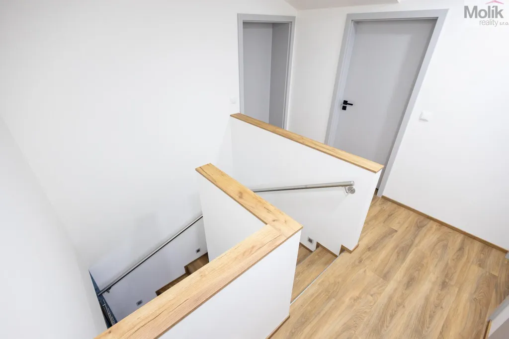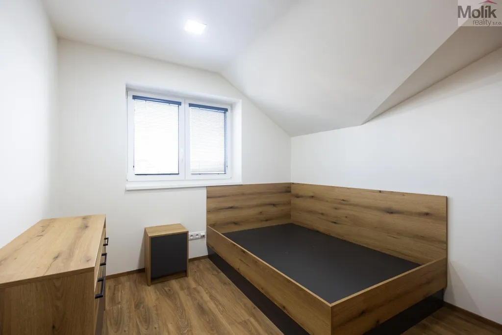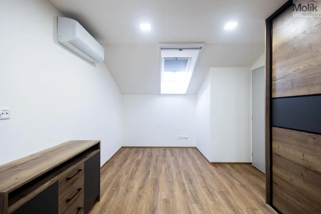 V patře se nachází 4 zařízené pokoje včetně nábytku, skříní a postelí s matracemi, to vše vyrobeno na zakázku, každý pokoj má klimatizaci, koupelna s WC, vanou, sprchový koutem a umyvadlem, technická místnost.