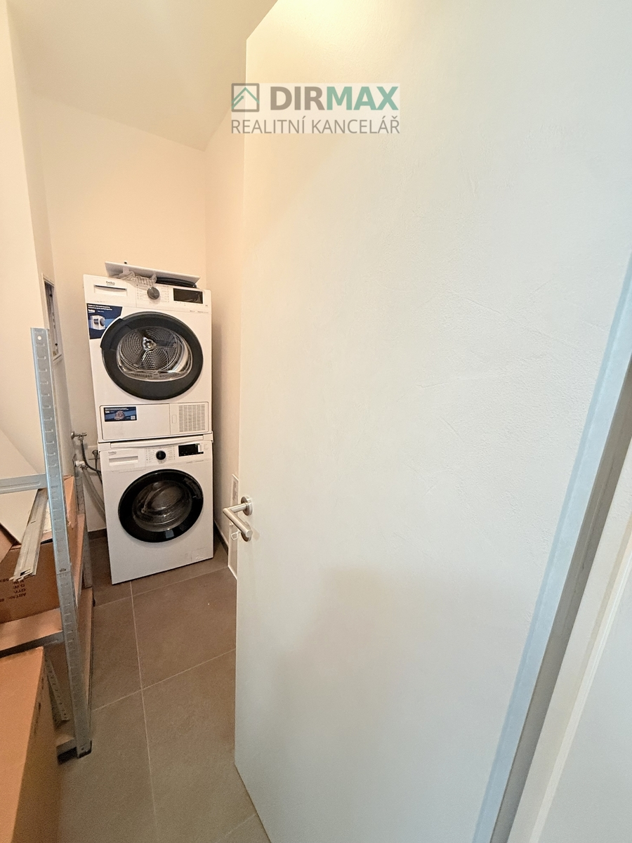 Za vchodovými dveřmi je předsíň s velkou vestavěnou skříní vyrobenou na míru. Z předsíně se dostanete do komory, kde je umístěná pračka se sušičkou, dále do koupelny s WC a v neposlední řadě do centrální místnosti - ta je vybavena kuchyňskou linkou s ostrůvkem, vyrobeno na míru. Kuchyně je vybavena vestavnými spotřebiči: varná deska, trouba, odsavač par, myčka nádobí, kombinovaná lednice s mrazákem. U ostrůvku jsou 2 barové židle. Dále navazuje obývací část vybavena prostorným pohodlným gaučem a konferenčním stolkem. Prostor je dále vybaven postelí a TV. Balkónovými dveřmi je z centrální místnosti přístupná předzahrádka, kde je část u domu vydlážděná a osazena 2 zahradními křesly a stolkem. O trávu je postaráno díky robotické sekačce na trávu.