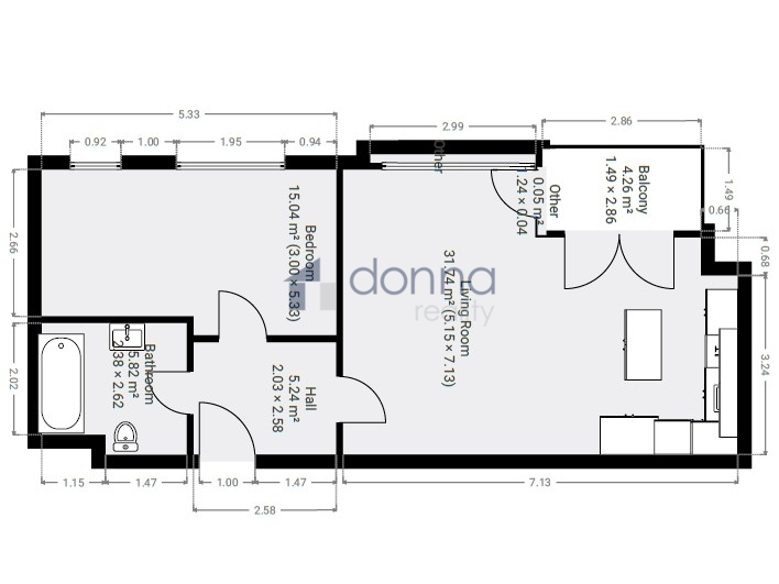 Dominantou bytu je obývací pokoj s kuchyňským koutem, ze kterého je vstup na balkon v létě s hezkým výhledem do zeleně.
