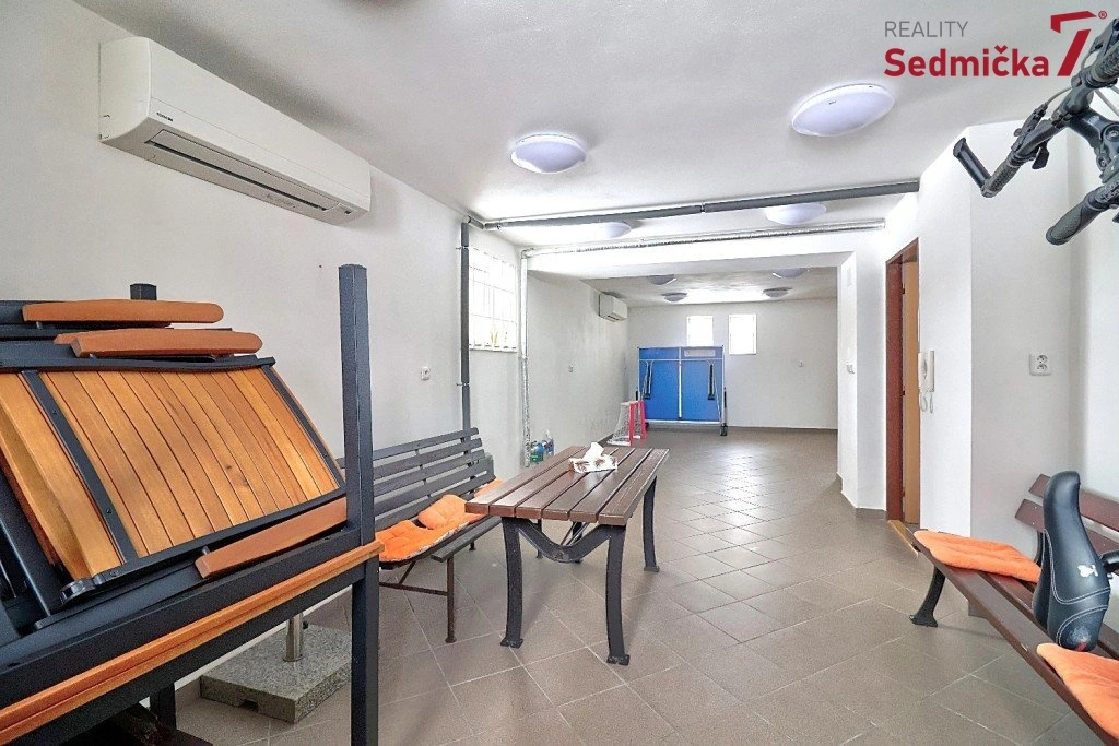 Také lze využívat společenskou místnost v suterénu s vytápěním, kde je možné provozovat různé aktivity, od dětských a sportovních (vybaveno stolem pro stolní tenis a brankami pro hraní dětského florbalu) až po různé oslavy narozenin, domovních schůzek, aj. Také zde je umístěno letní vybavení k ohništi v zahradě - stoly, gril a další.