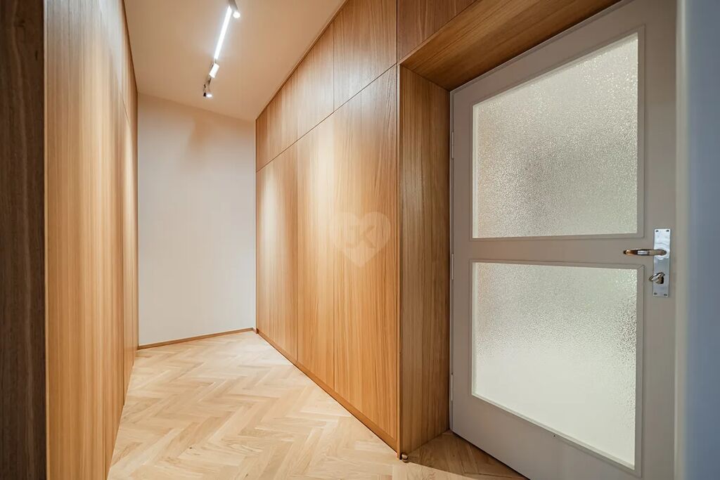 Z prostorné vstupní haly jsou samostatné vstupy do všech obytných i technických částí bytu. Originální truhlářské prvky, kuchyňská linka, vestavěné skříně od výrobce CZ Interiér.