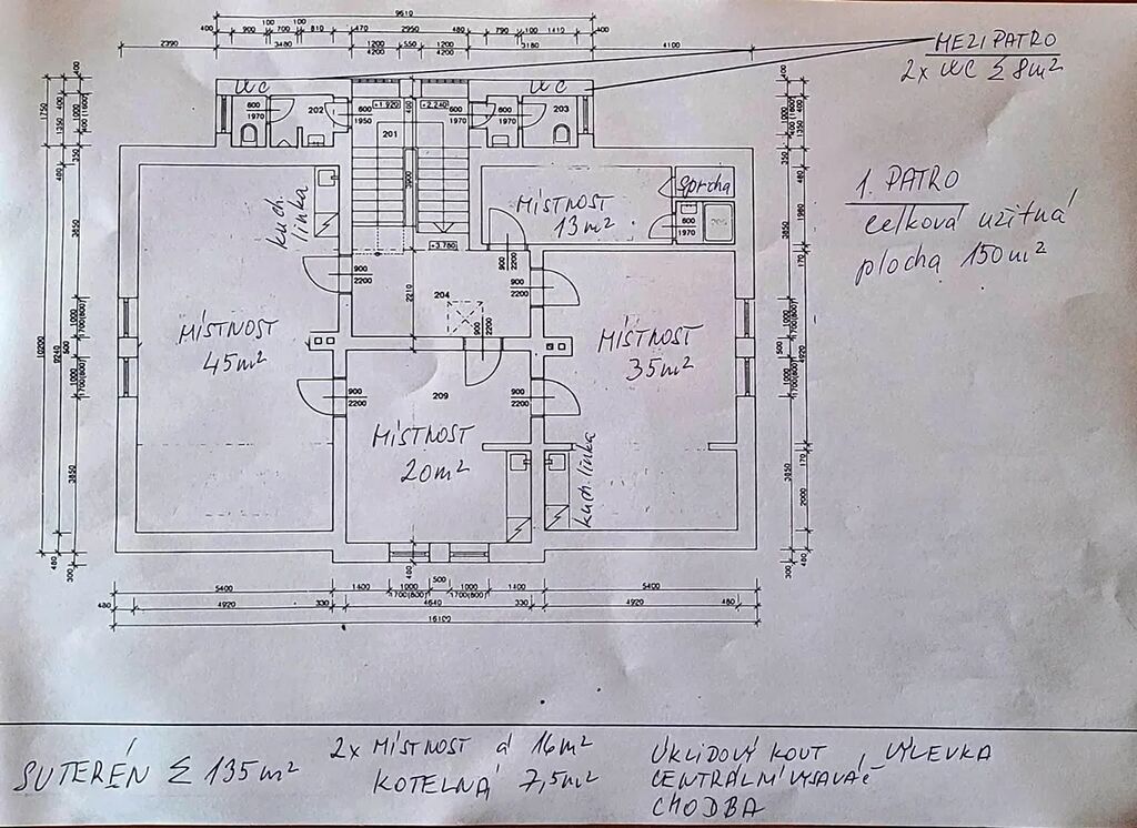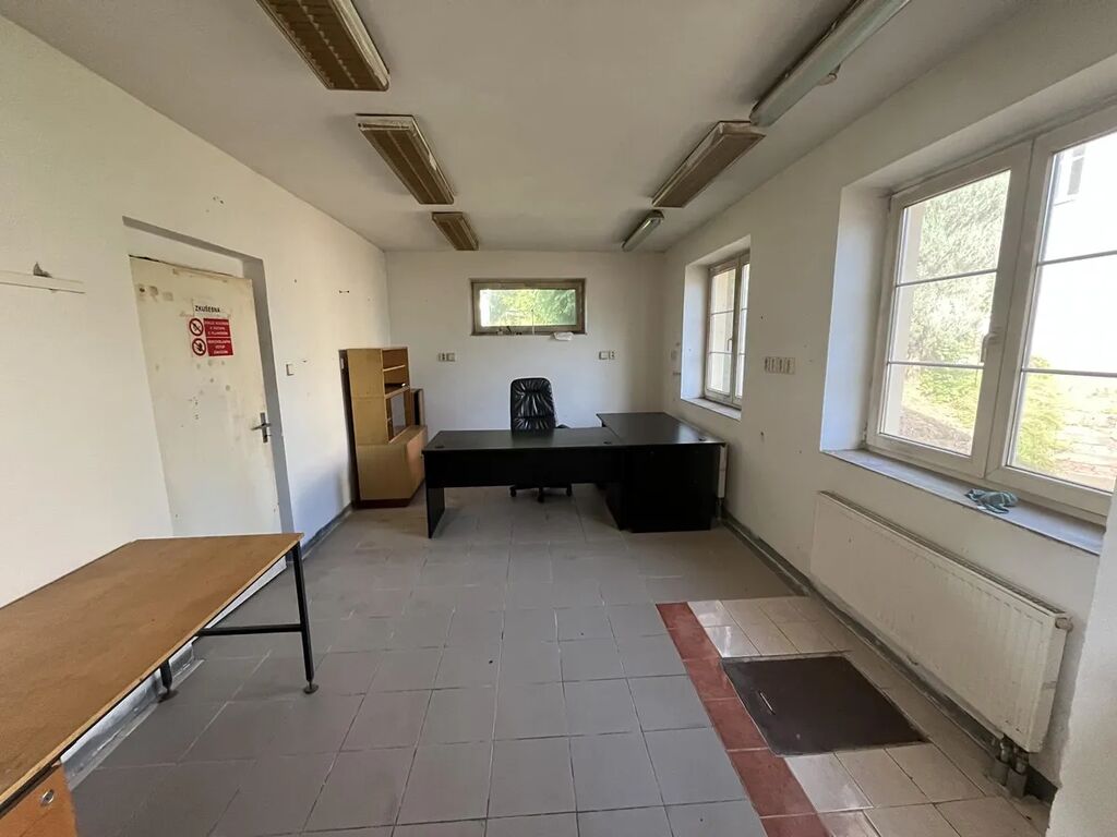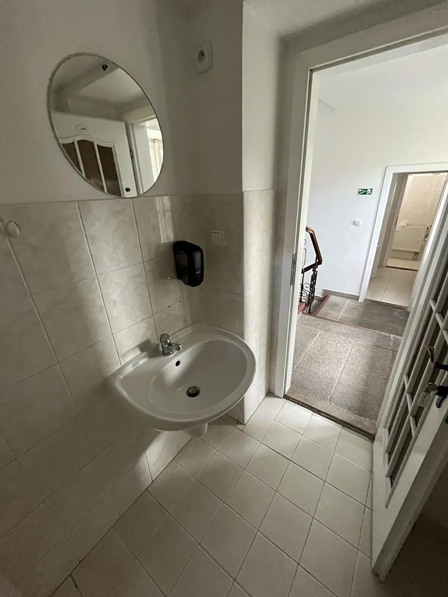 V přízemí se nachází velká uvítací kancelář, místnost s kuchyňským koutem a posezením, další 3 prostorné místnosti, koupelna se sprchou a umyvadlem, samostatné WC s pisoárem a umyvadlem. Z chodby je výstup jak do dvora tak schodištěm do mezipatra a 1.patra.