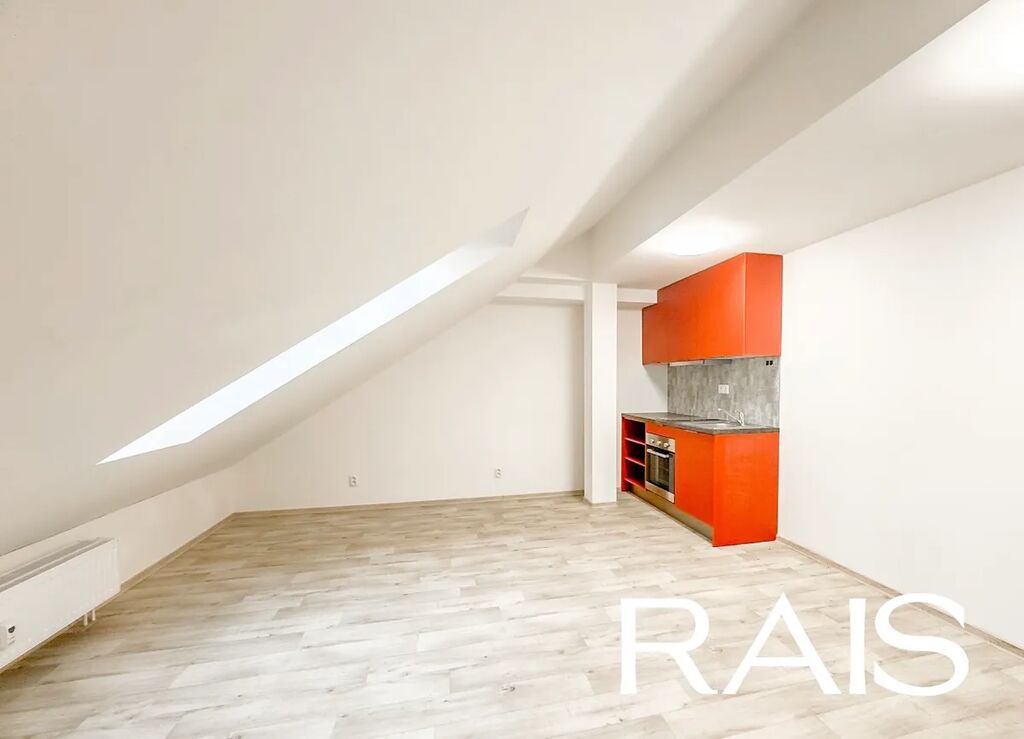 Podkrovní ateliérový prostor působí velmi příjemně, vzdušně a klidně, s pěkným výhledem na město. Prostorná koupelna je vybavena sprchovým koutem a nabízí dostatek místa, včetně prostoru pro pračku. Moderní kuchyňská linka je osazena vestavěnou lednicí, troubou a indukční varnou deskou.