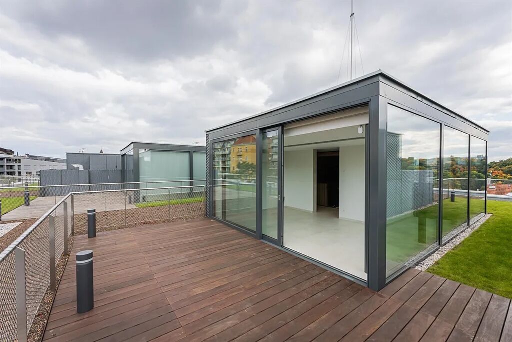 Luxusní nadstandardní moderní mezonet 5+kk (4 ložnice, 3 koupelny), s vlastním wellness & saunou, třemi terasami (28,24m2, 27,22m2, 25,5m2), zahradou 30,76 m2, celkovou obytnou plochou 211,7 m2, se nachází v 6. a 7. (posledním) patře v luxusním, v moderním rezidenčním komplexu s výtahem, recepcí, bazénem, saunou, prostornou zahradou ve dvoře, sklepem a možností parkování v podzemním parkovišti.