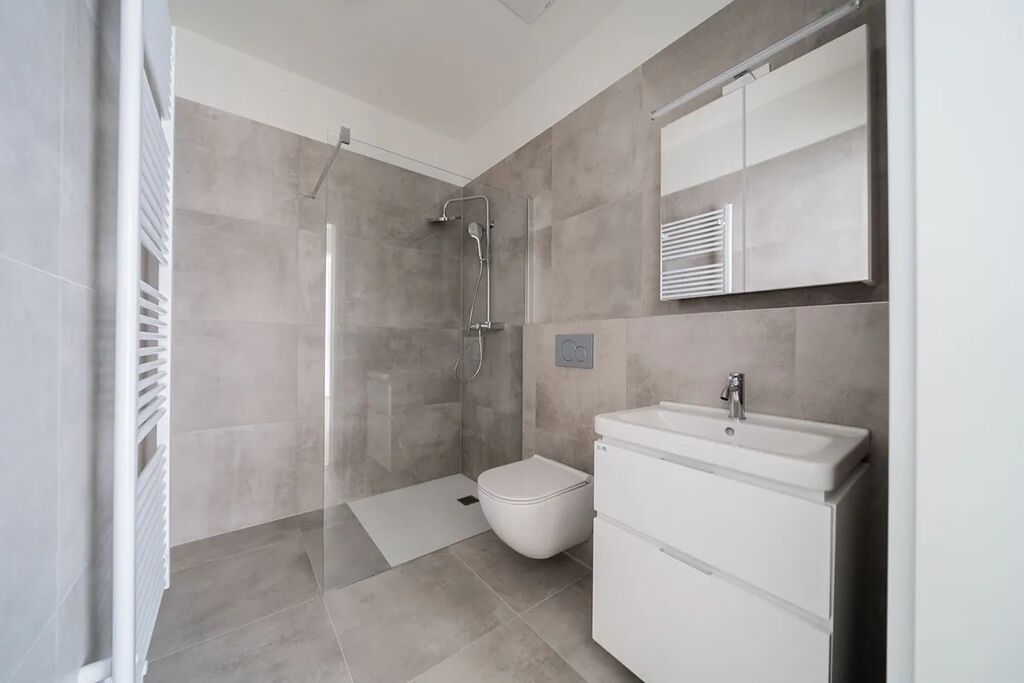 Interiér bytu je částečně zařízený a dispozičně nabízí vstupní chodbu (8,17m2), vzdušný světlý obývací pokoj (27,23m2) spojený s kuchyňskou částí s novou kuchyňskou linkou vybavenou moderními spotřebiči ( varná deska, trouba, vestavěná lednice s mrazákem a myčka). Dále byt nabízí dvě samostatné ložnice (17,89m2; 17,24m2) a moderní koupelnu (4,62m2) s komfortním sprchovým koutem a toaletou, další samostatnou toaletu (1,81m2) a komoru (1,39m2). Možnost dovybavit byt pračkou/sušičkou. Podlahy: vinylová a keramická dlažba. Topení v bytě: podlahové. K bytu náleží sklep. K dispozici je i kolárna a kočárkárna.
