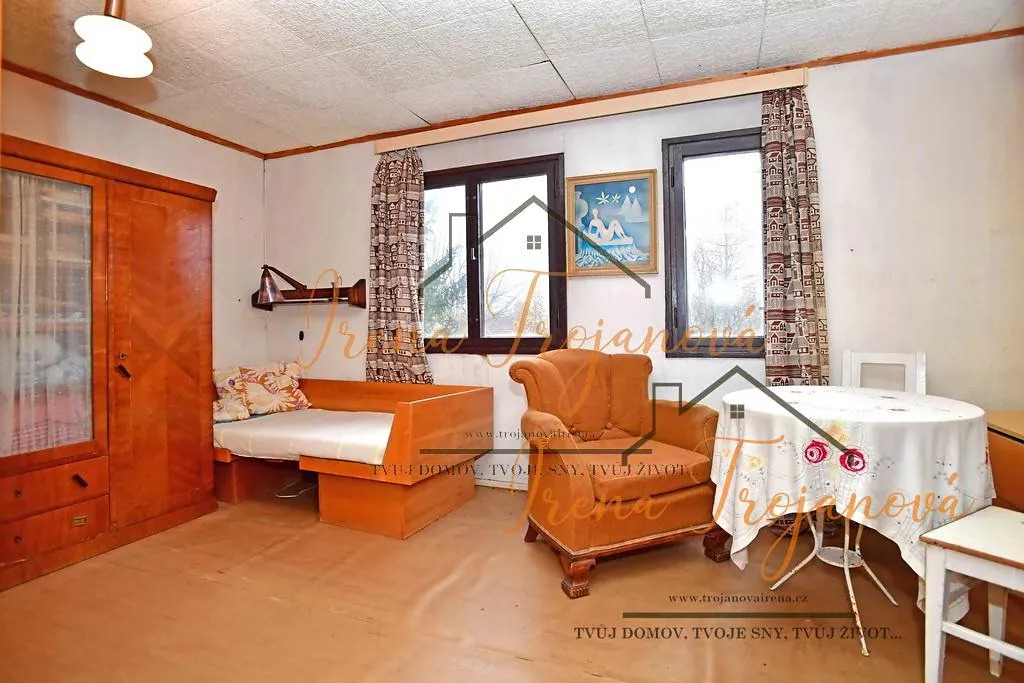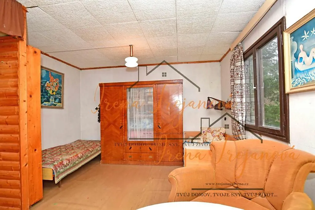 Chata je postavena ve svahu na zděné podezdívce, nepodsklepená, střecha sedlová. V přízemí se nachází malá kuchyňka s obývacím pokojem se vstupem na terasu orientovanou na JZ a koupelna s vanou. Do patra se dostanete z druhé části chaty, kde se nachází pokoj s výhledem do krajiny a WC. Na podlaze je lino, okna jsou nová dřevěná. Vytápění je řešeno kamny a přímotopy, odpad septikem. Elektroinstalace 220 i 380. Kopaná studna je společná pro 3 chaty s dostatečným množstvím vody. Teplou vodu zajišťuje průtokový ohřívač. Orientace oken na východ, jih a západ. Svažitý pozemek je terasovitě řešený, najdete zde vzrostlé stromy a skalky, zahradní domek a dřevník. Možnost parkování u pozemku. Příjezd po místní komunikaci, která je asfaltová.
