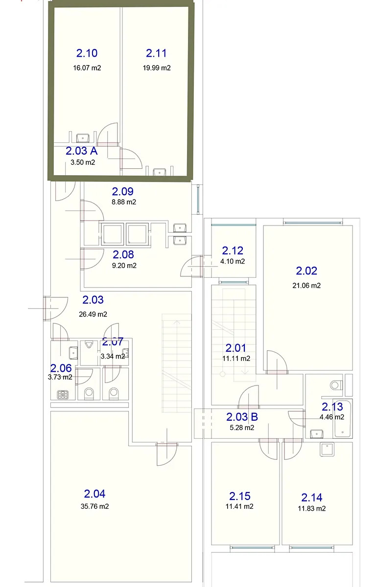 • Vstup přes vlastní předsíňku (3,5 m²), která navazuje na dvě samostatné kanceláře ( 20 m² a16 m²)