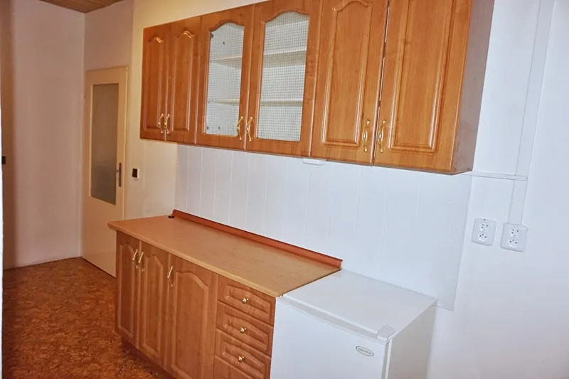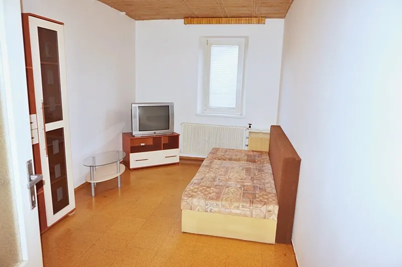 Dispozice – pokoj s kuchyňským koutem 19 m², samostatný pokoj 14 m², předsíň, koupelna s vanou, společně s WC, francouzské okno. Internet v ceně pronájmu.