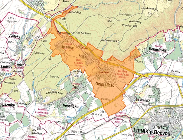 Jedná se o polovinu pozemku p.č. 374/1 – ovocný sad o celkové výměře 4.506 m2 v obci Dolní Újezd, Staměřice. Oplocená zahrada leží v okrajové části nesrostlé s obcí, v lokalitě nazvané Mokř.