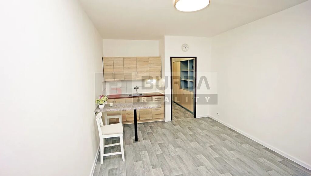 V bytě je kuchyňská linka v odstínu dub sonoma, s nerezovým dřezem a keramickým obkladem. Před kuchyňskou linkou je konzumní pult se dvěma židlemi. V pokoji je nové stropní svítidlo s dálkovým ovladačem.