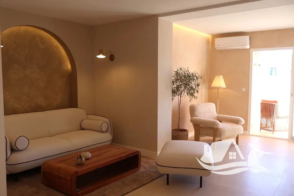 Interiér prošel kompletní rekonstrukcí – vyměněny byly všechny instalace, okna mají dvojité i trojité zasklení a použité barvy jsou ekologické. Byt tvoří prostorný obývací pokoj s bioalkoholovým krbem, plně vybavená kuchyně s moderními spotřebiči, tři pohodlné ložnice a dvě koupelny. V hlavní části je klimatizace, další klimatizační jednotka je v ložnici a ve druhé ložnici je stropní ventilátor pro příjemné klima po celý rok.