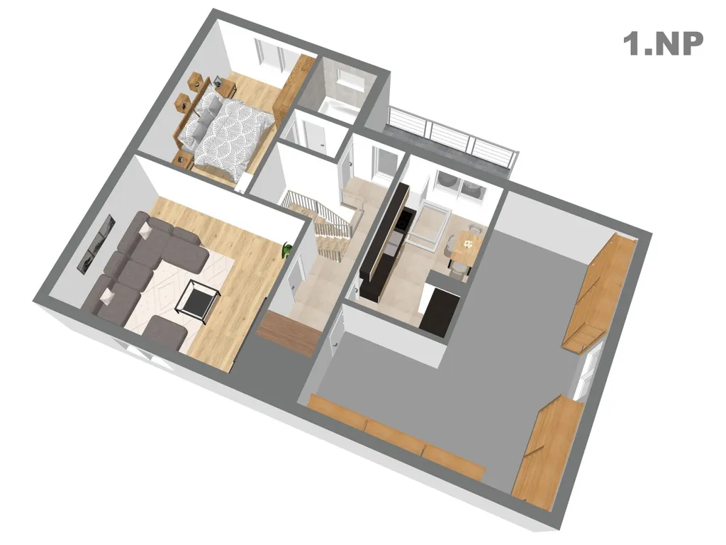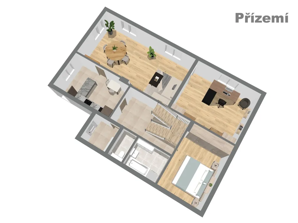 Přízemí: 141,04 m² (hlavní obytné patro – obývací pokoj s jídelnou, 2 pokoje, kuchyň, sociální zázemí)