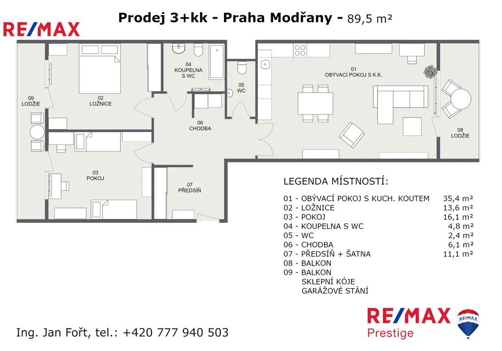 Byt se nachází ve fázi F, etapě C (objekty F10–F13) v Praze 4 – Modřanech. Je orientovaný na dvě světové strany a nabízí vstup na balkon z každé obytné místnosti. K dispozici jsou dva balkony o velikosti 8 m² a 9 m², garážové parkovací místo a sklepní kóje o velikosti 4,3 m².