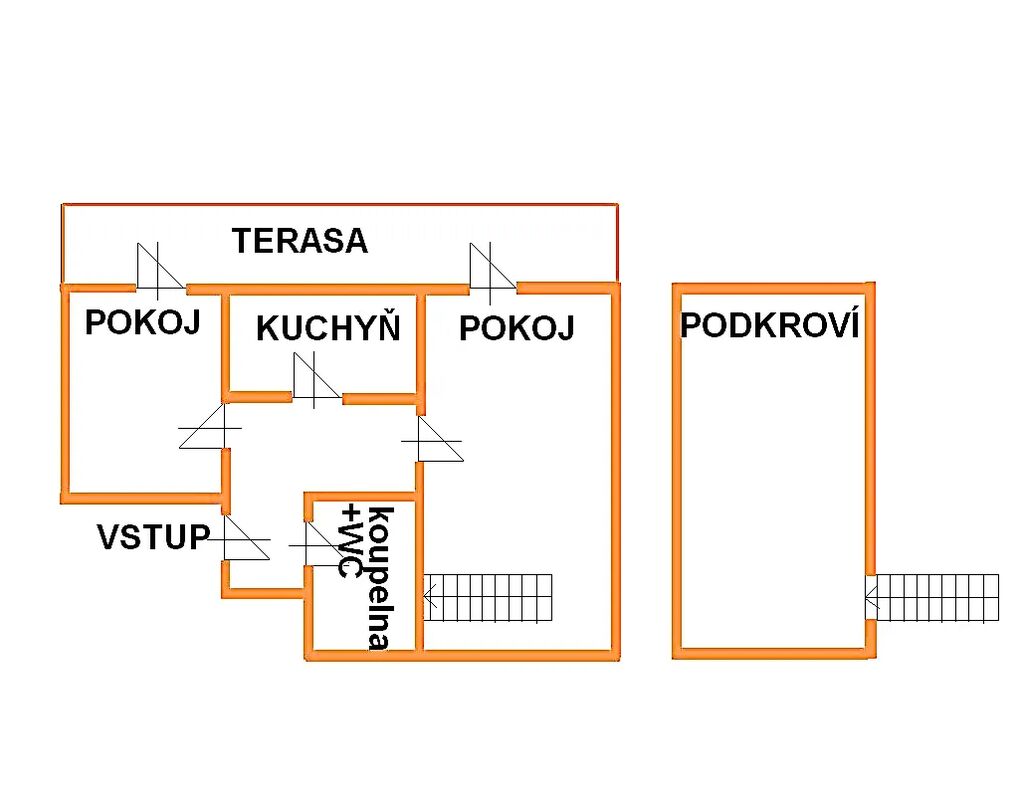Menší samostatný pokoj(cca12m2) je vedle kuchyně, z obývacího pokoje (cca 25m2)je přístup po schodech do otevřeného podkroví. (cca 15m2).Oba spodní pokoje mají vstup na terasu.