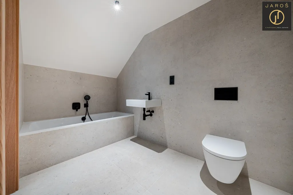 Spodní podlaží tvoří klidová část s prostornou ložnicí, moderní koupelnou a chodbou se zázemím. O patro výš se otevírá impozantní obývací pokoj s kuchyňským koutem o ploše více než 38 m², který díky velkým oknům působí vzdušně a svěže. Druhý pokoj s koupelnou doplňuje funkčnost této jednotky a umožňuje komfortní využití pro rodinu, hosty či investiční provoz formou krátkodobých pronájmů.