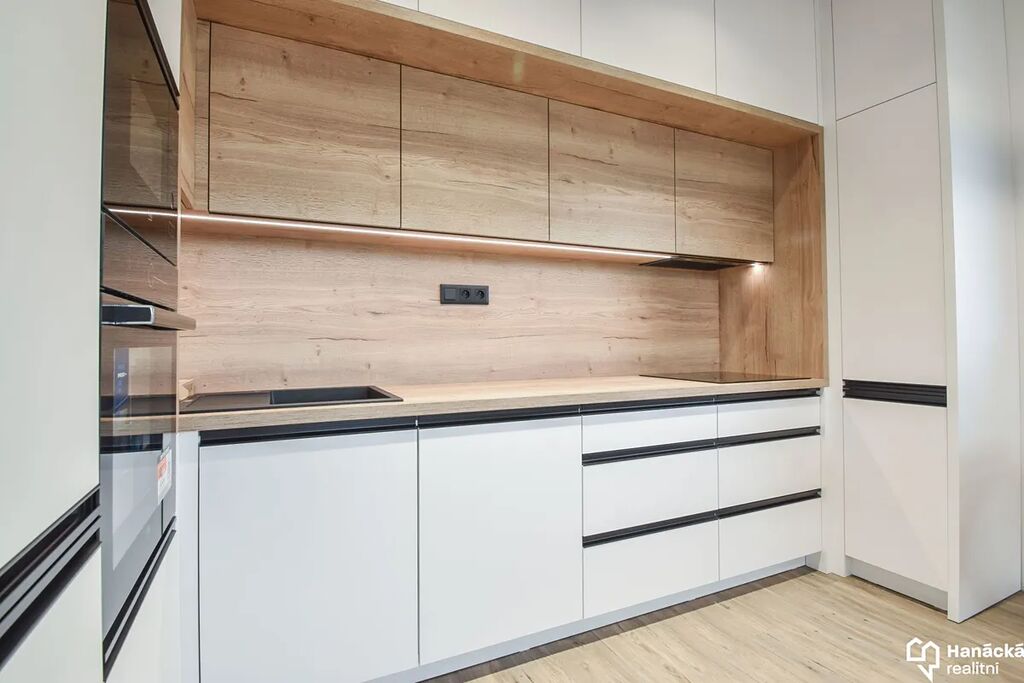 - Kompletně zařízený kuchyňský kout s vestavěnými spotřebiči: lednice, myčka, indukční varná deska, elektrická trouba, mikrovlnná trouba