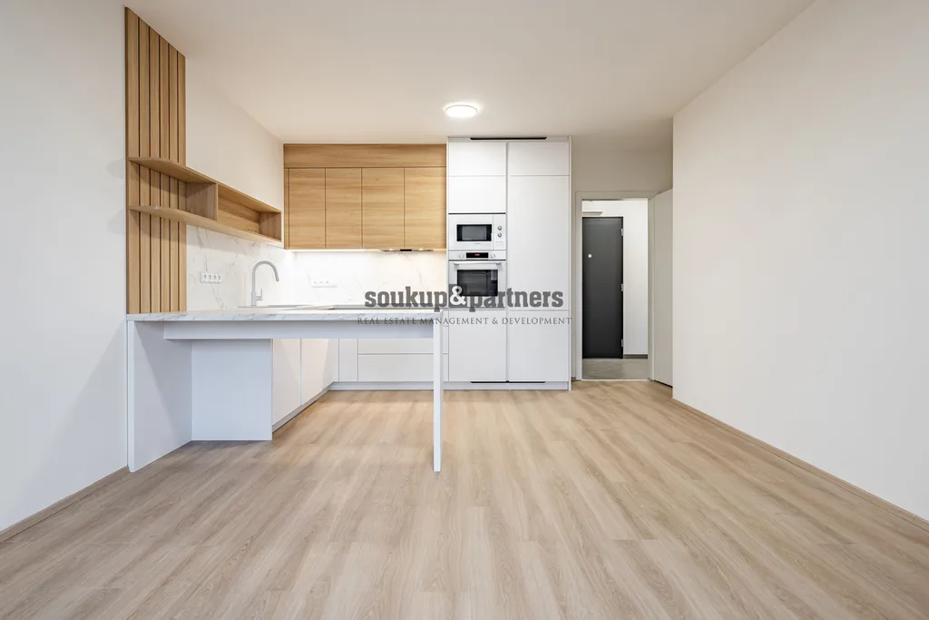 Součástí bytu je nadstandardně provedená kuchyňská linka s kvalitními materiály a plně vybavená kvalitními vestavěnými spotřebiči: myčka Miele, lednice s mrazákem, indukční varná deska, horkovzdušná a mikrovlnná trouba Bosch. Linka je navržena tak, aby poskytovala dostatek úložných prostor, praktický pult využitelný jako jídelní místo či pracovní plocha a plnohodnotné zázemí pro každodenní vaření i práci z domova.