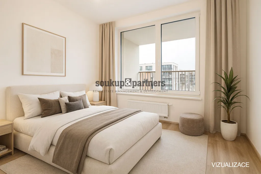 Ložnice působí vzdušně díky velkému francouzskému oknu orientovanému směrem k lodžii a nabízí prakticky oddělený kout pro šatnu.