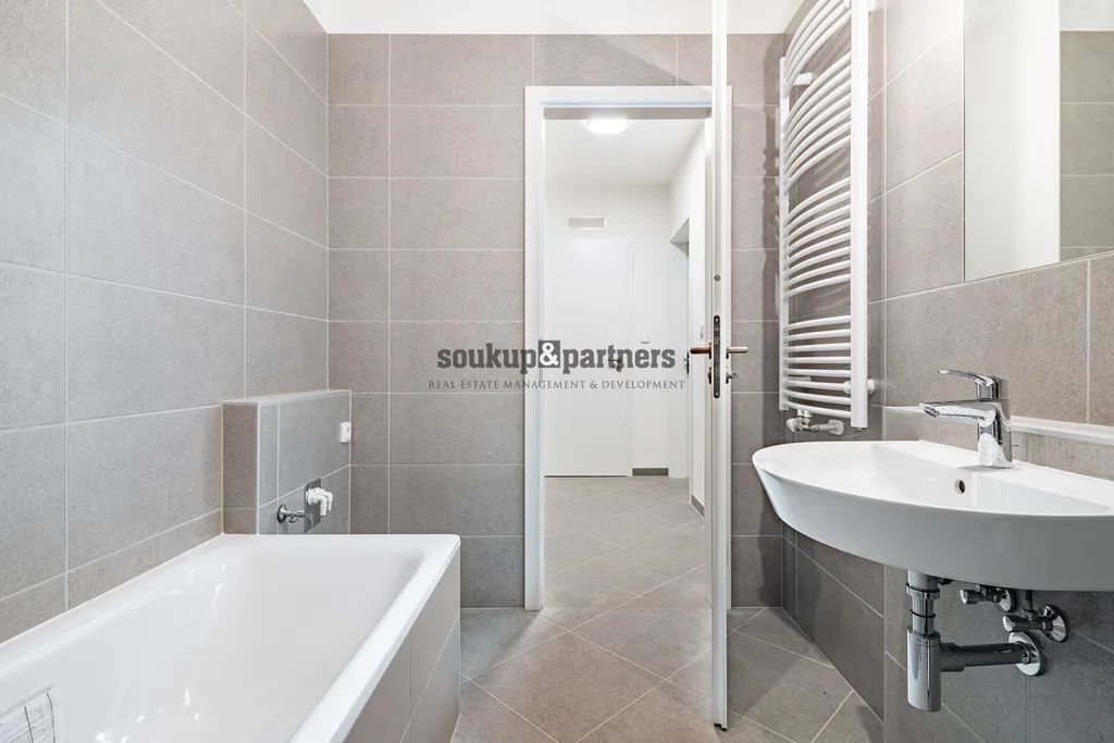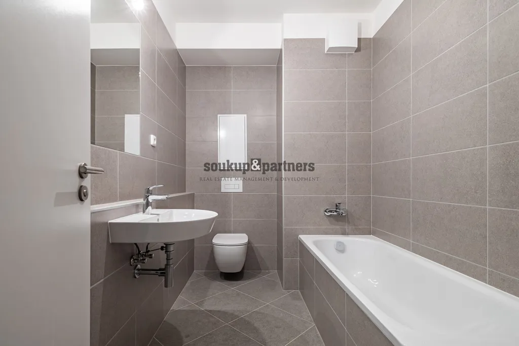 Koupelna je provedena nadstandardně - s vanou, závěsným WC a materiály, které ladí se zbytkem interiéru.