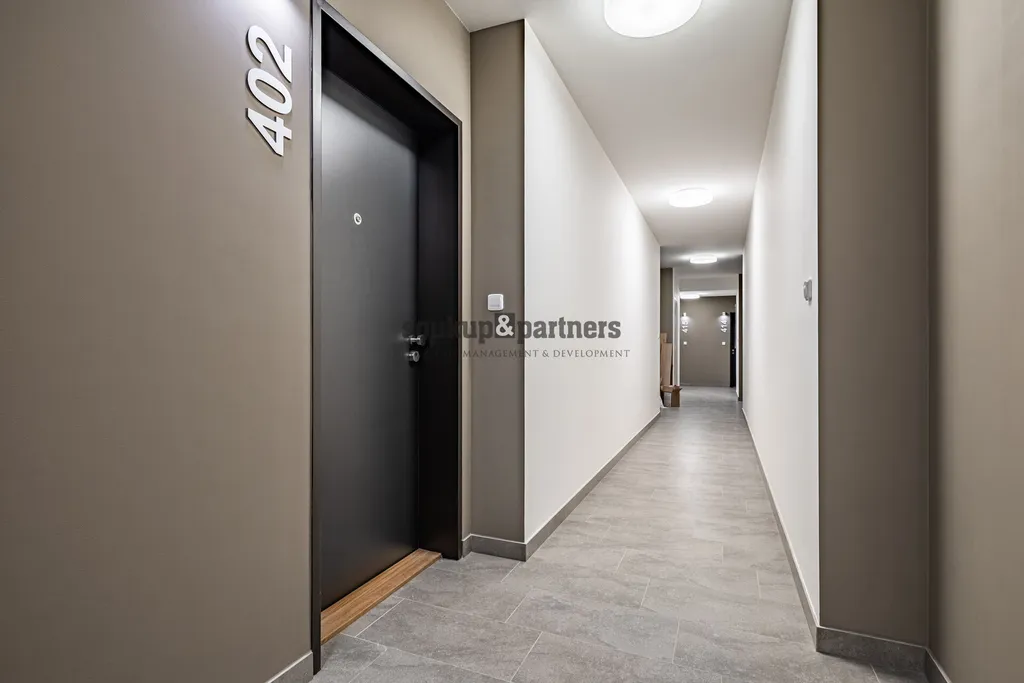 Interiér dále doplňuje vinylová podlaha v dekoru dřeva, kvalitní interiérové dveře Sapelli a protipožární vstupní dveře. V obou obytných místnostech je přípojka na optický internet (až 2Gb/s). Byt je navíc vybaven tzv. průvětrníky, jež umožňují cirkulaci vzduchu i při zavřených oknech.