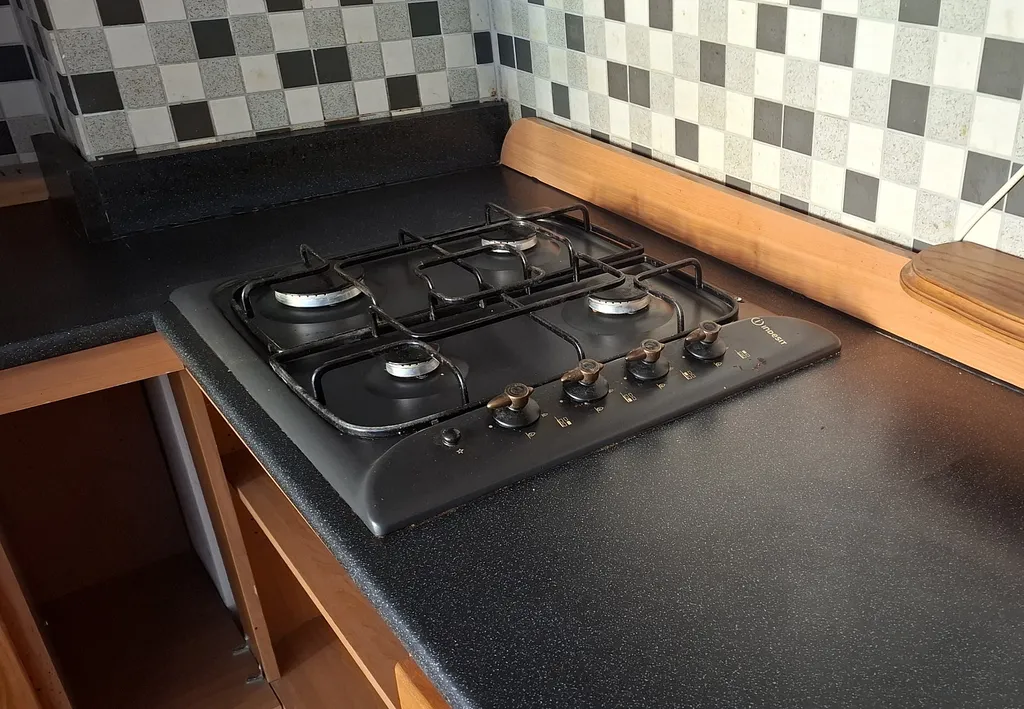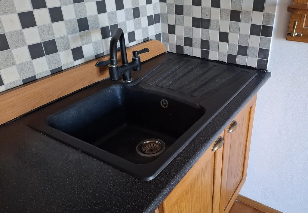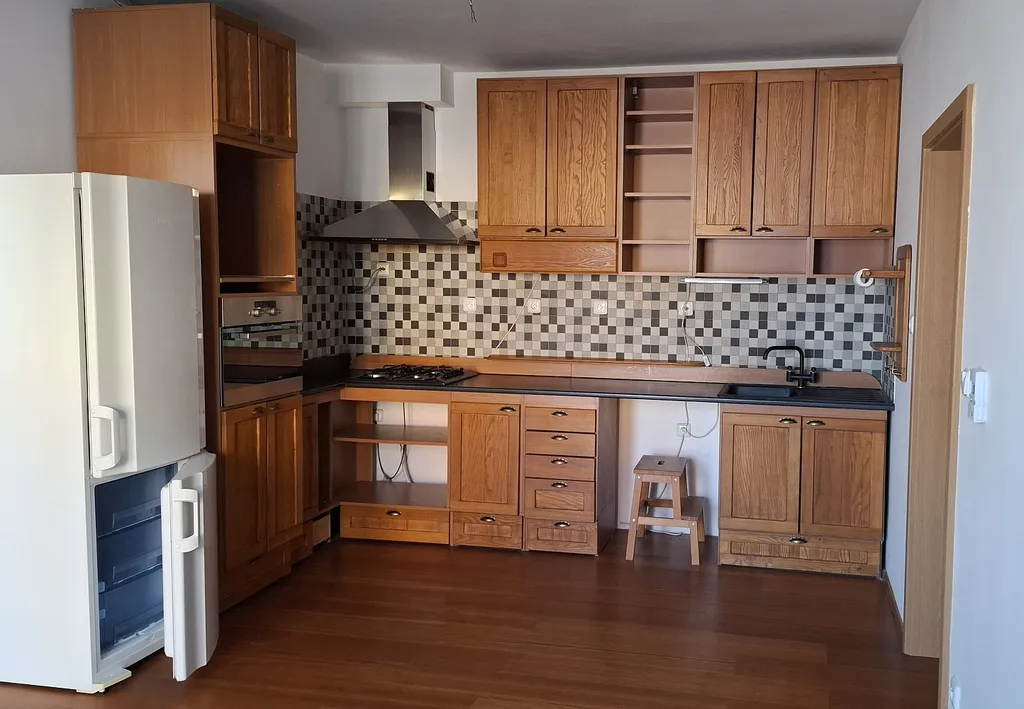 V kuchyni je dřevěná (jasan) kuchyňská linka na míru (horní, spodní skříňky, úložné prostory), která je vybavena vestavěnými spotřebiči: plynová varná deska zn.: INDESIT, samostatná vestavěná el. trouba zn.: WHIRPOOL, lednice s mrazákem zn: GORENJE, digestoř s odtahem zn.: ELECTROLUX, granitový dřez s pákovou stojánkovou vodovodní baterií. V kuchyňské lince je příprava a prostor na myčku nádobí. Podlaha dřevěná (Teak). Z kuchyně se vchází na balkon – 4,6m². Nad oknem je dřevěná garnýž.