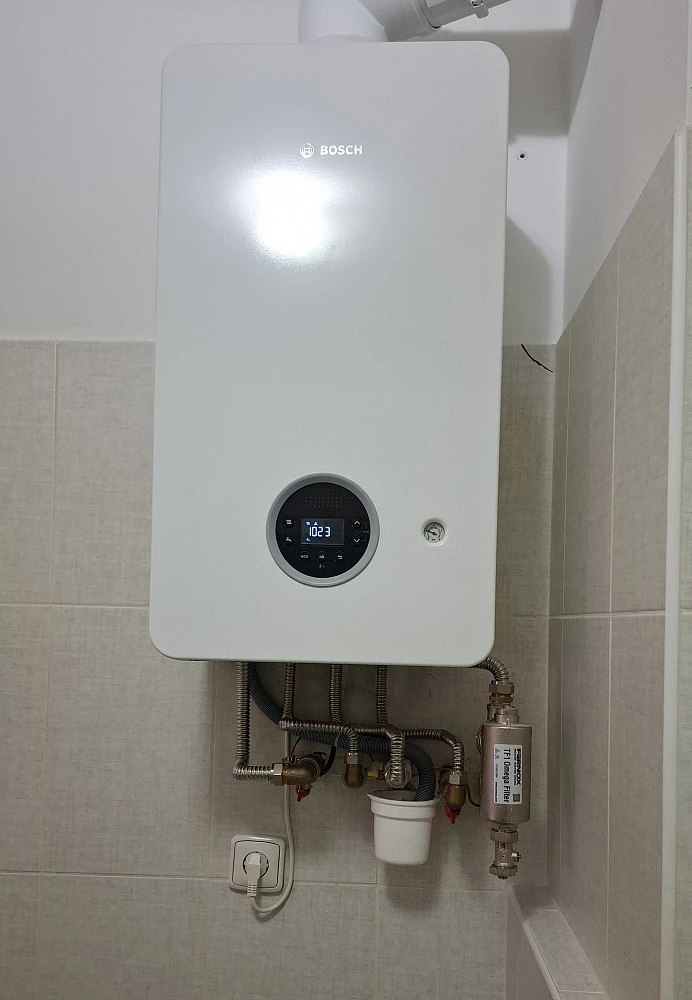 Koupelna s vanou, umyvadlem se zrcadlovou skříňkou a WC. Keramické obklady. V koupelně je dále kombinovaný nástěnný plynový kotel zn.: BOSCH, pro ohřev teplé vody a vytápění bytu, přípojka vody včetně odpadu na pračku a vlastní vodoměr přináležející k bytu.