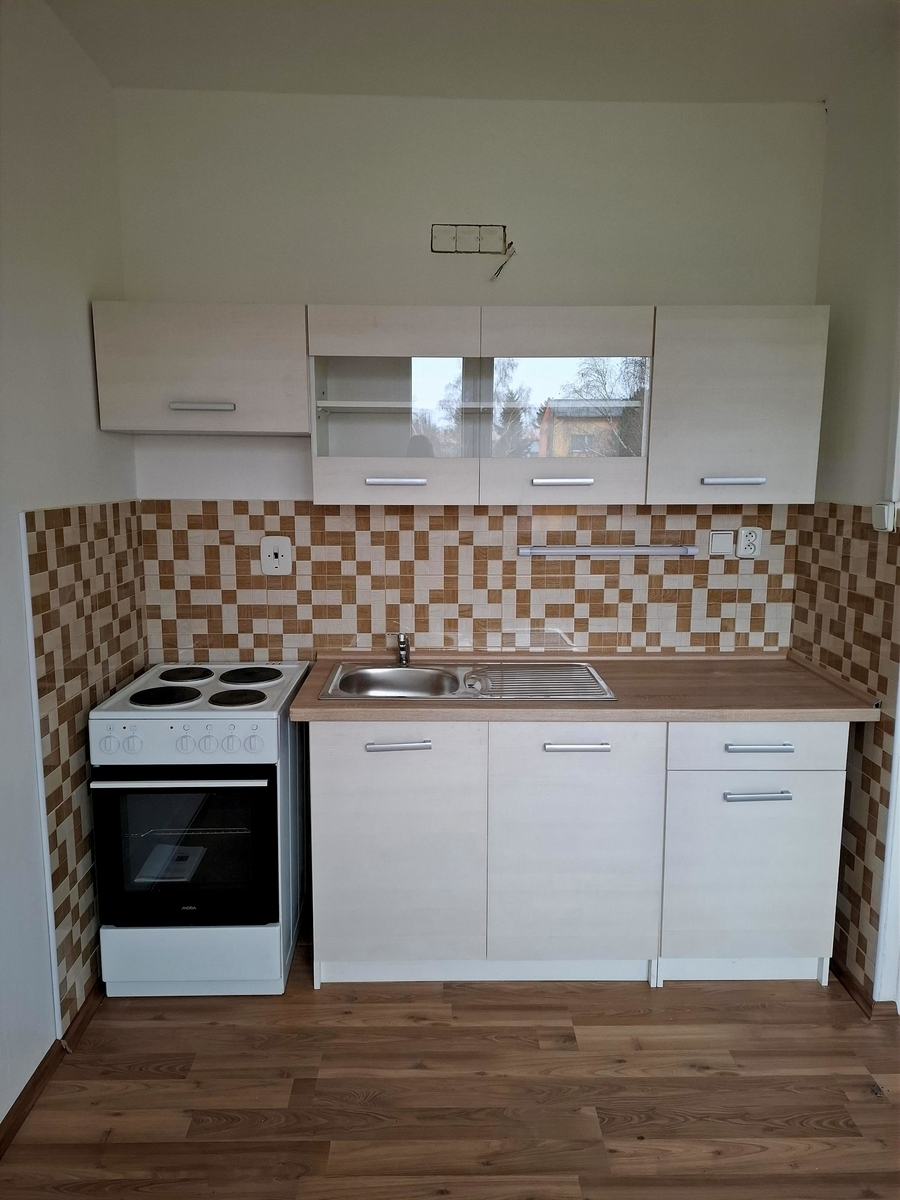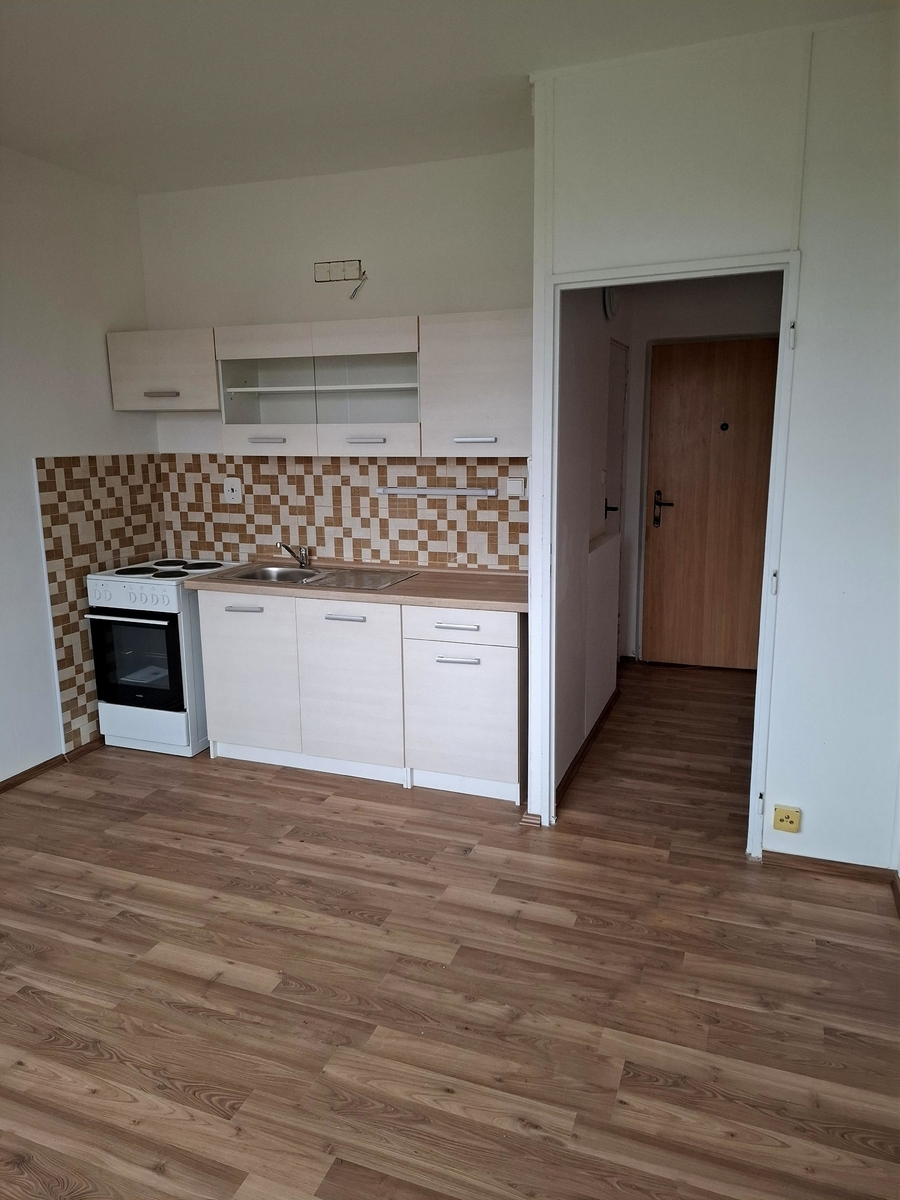 Byt se skládá z obytné místnosti s kuchyňským koutem, koupelny se sprchovým koutem a WC. Interiér bytu je bez nábytku. Byt prošel rekonstrukcí v r. 2025 nová kuchyně, podlahy, koupelna a WC.