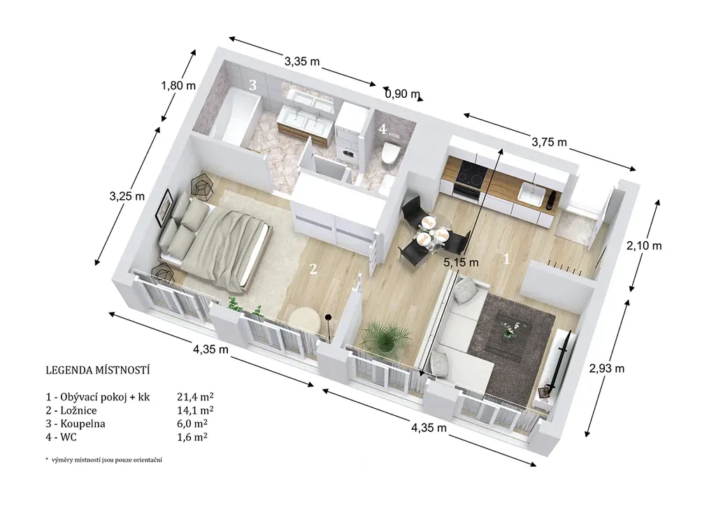 - Skutečné 2+kk – obývací pokoj s kuchyní cca 21 m², ložnice cca 14 m² se vstupem přes dvoukřídlé dveře.