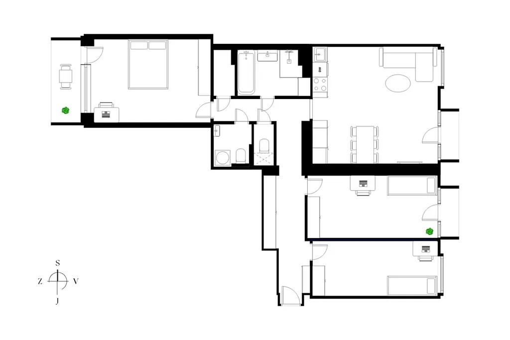 Dispozice bytu nabízí světlý a prostorný obývací pokoj s kuchyňským koutem a vstupem na zasklenou lodžii o velikosti 1,2 m². Dále jsou zde tři samostatné pokoje vhodné jako ložnice, dětský pokoj či pracovna - dva z nich mají vlastní lodžii (hlavní ložnice 3,6 m², druhý pokoj 1,2 m²). K dispozici je koupelna se sprchovým koutem i vanou, dvě samostatné toalety, technická místnost/komora a chodba poskytuje dostatek úložného prostoru. K bytu náleží sklep o velikosti 2 m².
