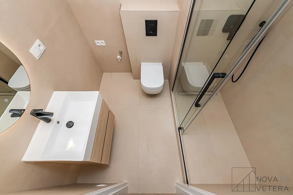 Interiér bytu právě prochází kompletní rekonstrukcí, která zahrnuje nové rozvody elektřiny, vody a odpadu, nové dřevěné podlahy, obklady a dlažby italské značky Marazzi, stejně jako koupelnu a toaletu se sanitou Grohe. Součástí vybavení je kuchyňská linka na míru se spotřebiči prémiové značky Bosch.