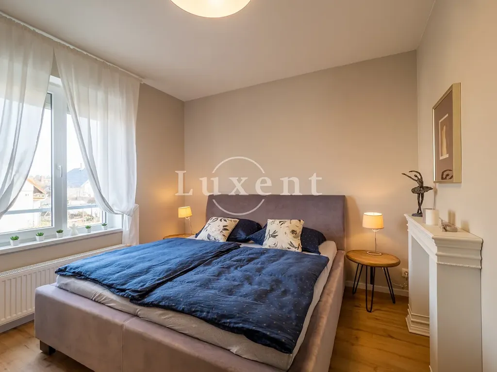 Dispozice bytu zahrnují prostornou obývací místnost s pohodlnou sedací soupravou, jídelním stolem, barovým pultem a kompletně vybaveným kuchyňským koutem všemi spotřebiči, ložnici s manželskou postelí, vlastní šatnou a dalším vestavěným úložným prostorem, koupelnu se sprchovým koutem, oddělenou toaletu a komoru s pračkou. Součástí vstupní chodby jsou vestavěné skříně na míru. Všechna okna jsou vybavena předokenními elektrickými roletami na dálkové ovládání. K bytu náleží jedno garážové stání a sklep.