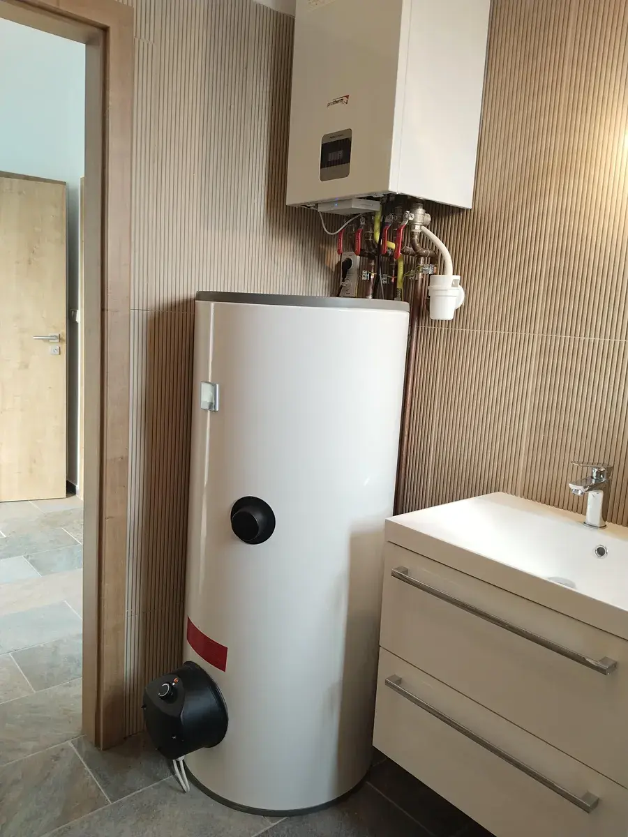 Vytápění a ohřev vody objektu zajišťuje plynový kondenzační kotel v kombinaci se solárními panely, (solární panely pouze na ohřev vody).