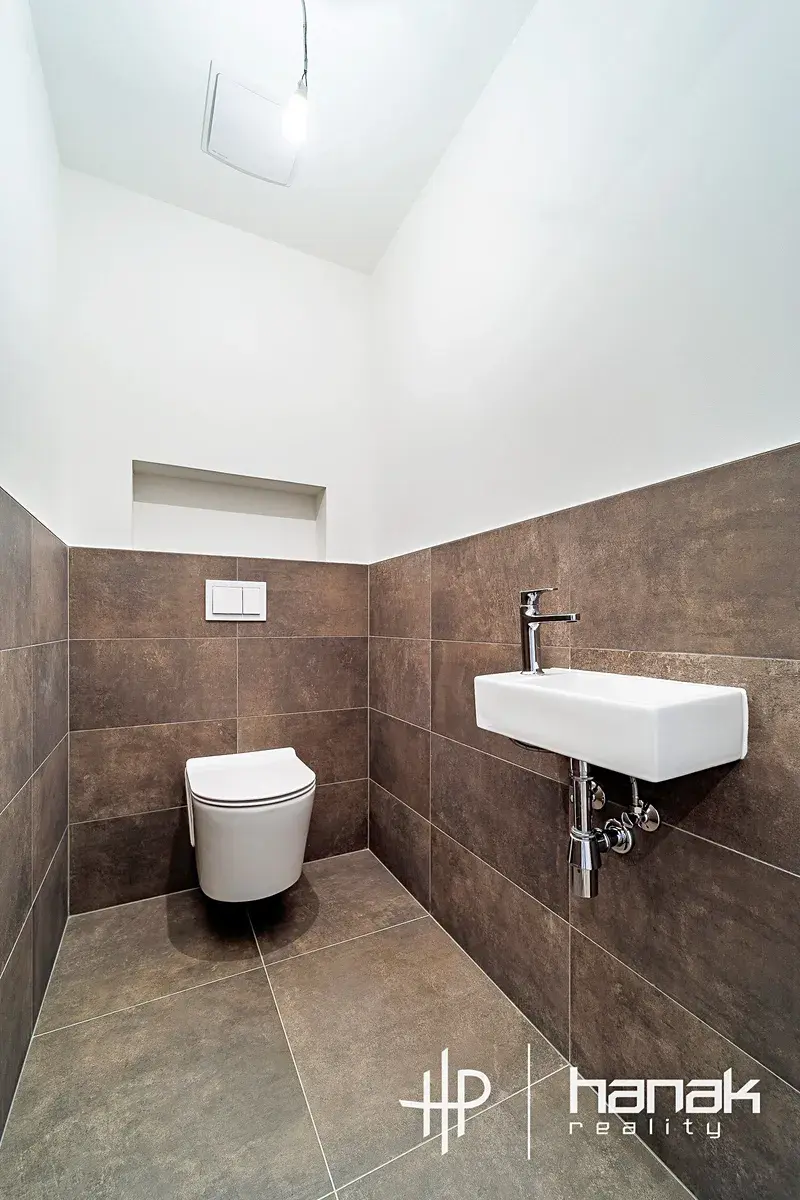Dispozice nabízí prostornou chodbu, ze které jsou samostatné vstupy do pokojů, a koupelnu s toaletou.