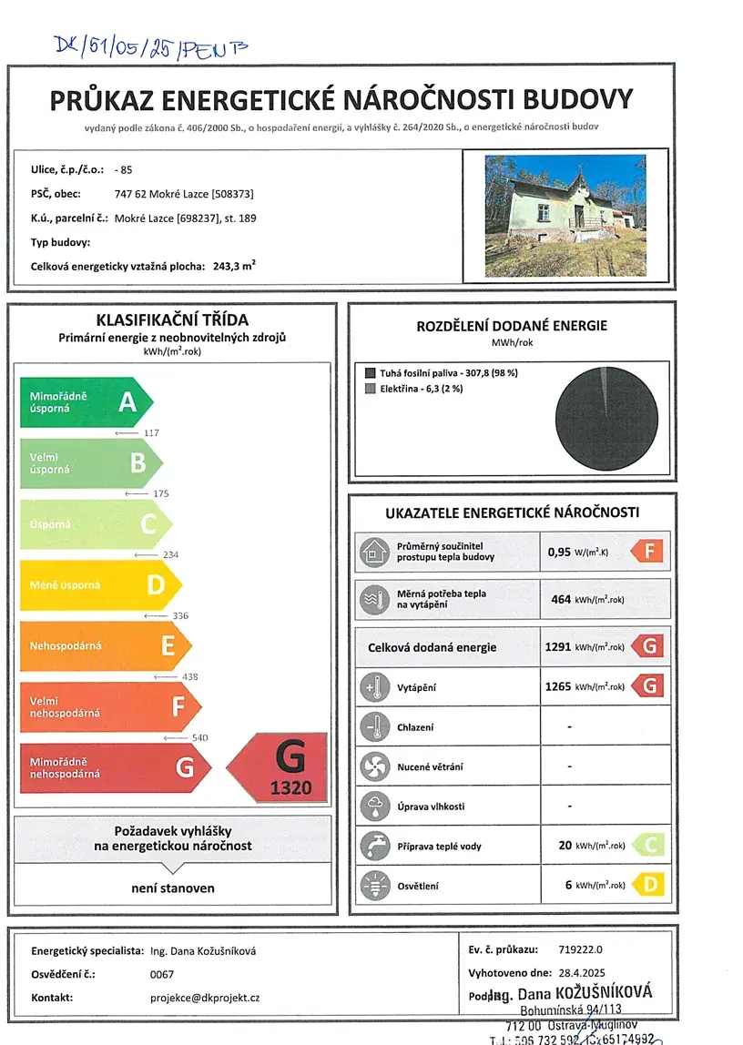 Jedná se o rodinný dům, podsklepený, o jednom nadzemím podlaží a částečným podkrovím. Dispozice objektu: v přízemí se nachází chodba se schodištěm, kotelna, technická místnost a 6x sklad, dále v 1. NP se nachází chodba, schodiště, technická místnost, kuchyně, jídelna, koupelna, ložnice a obývací pokoj a v podkroví je schodiště a 1x pokoj.