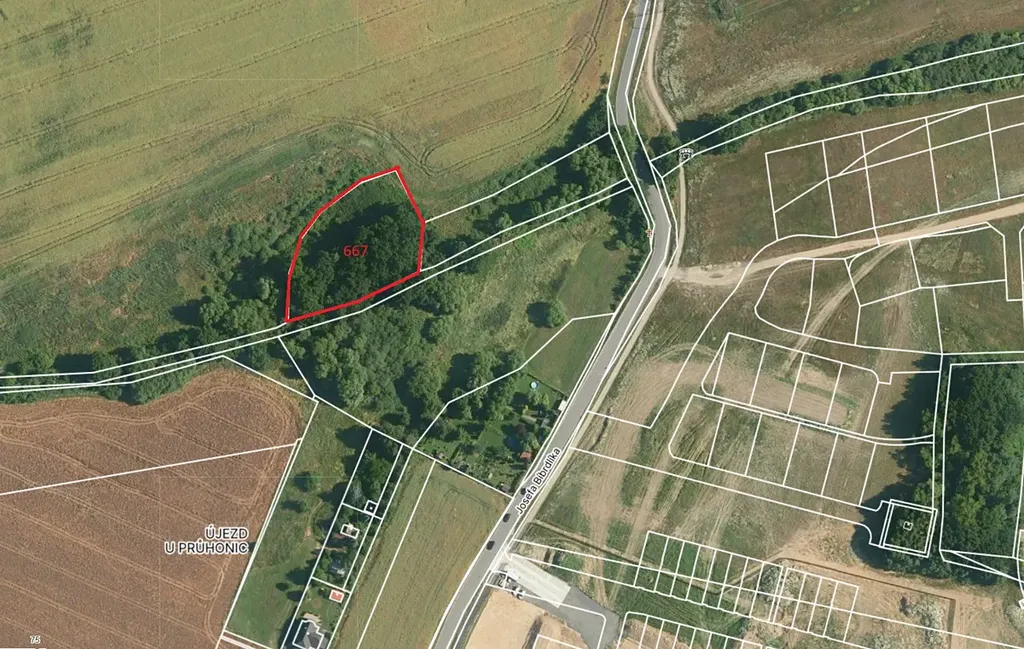 Lesní pozemek p.č. 667 tvoří ojedinělou zeleň v komplexu rozšiřující se bytové a komerční zástavby podél dálnice D1 a je zcela obklopen zemědělskou půdou. Ze severní strany do pozemku zasahuje ochranné pásmo elektrovodu.