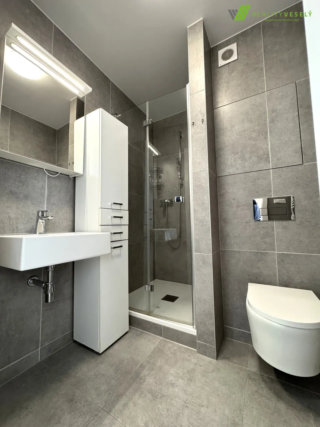 Byt se skládá ze vstupní chodby, z níž je vstup do koupelny se sprchovým koutem, umyvadlem a toaletou. Z chodby dále vcházíme do pokoje s plně vybaveným kuchyňským koutem, jehož součástí je indukční varná deska, pečicí trouba, odsavač par, mikrovlnná trouba, lednice a také pračka. Na pokoj s kuchyňskou linkou navazuje další prostorný pokoj. Oba pokoje disponují vnitřními zatemňujícími roletami.