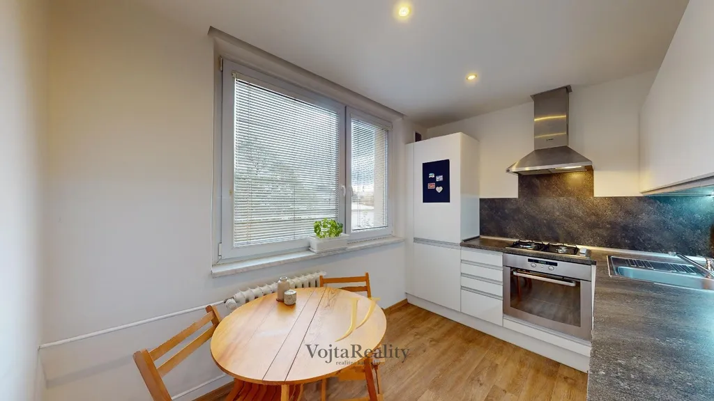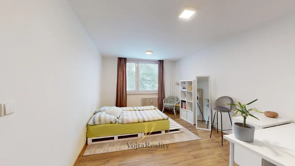 Byt, který byl zrekonstruován v roce 2018 se nachází ve 2. NP (1.patro) a je situován do klidného vnitrobloku. Dispozice bytu nabízí vstupní předsíň, která obepíná zděné bytové jádro, kdy z předsíně vpravo se nachází hlavní obytná místnost, následně z předsíň ústí do kuchyně. Kuchyň je vybavena vestavěnými spotřebiči a policovými skříněmi. Koupelna disponuje vestavěným sprchovým koutem a automatickou pračkou, WC se nachází v oddělené místnosti. Hlavní obývací místnost se pronajímá nevybavená.