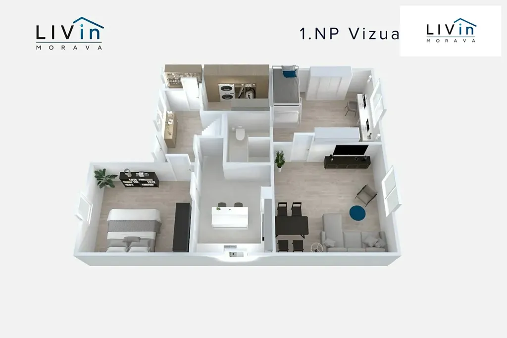 První nadzemní podlaží je v současnosti rozděleno na dva samostatné byty, přičemž jednoduchým odstraněním sádrokartonové příčky lze dispozici vrátit do původní podoby se třemi obytnými místnostmi, kuchyní a dvěma komorami/šatnami - vizualizace viz půdorys. Byt 2+kk o užitné ploše 50 m² tvoří předsíň, koupelna se sprchovým koutem a dvě obytné místnosti (jedna s kuchyňským koutem). Byt 1+1 o užitné ploše 23 m² zahrnuje obývací pokoj, kuchyň a koupelnu se sprchovým koutem.
