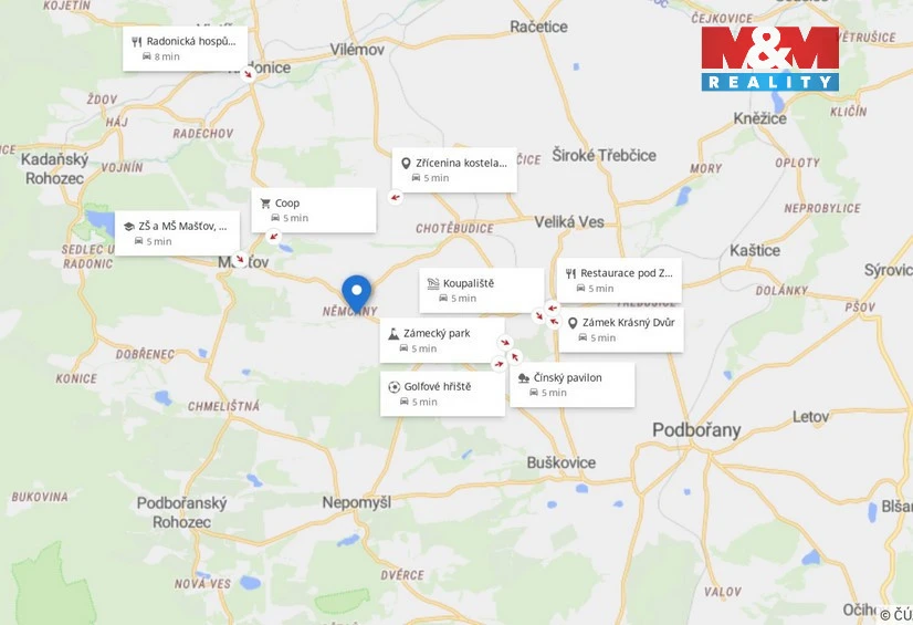 Dojezdové vzdálenosti: Podbořany cca 10 minut, CHKO Křivoklátsko cca 53 minut, Praha cca 1 hodina, 15 minut.