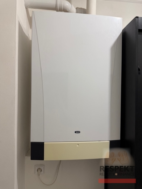 Další výhodou je vlastní plynový kotel s ohřevem vody, umístěný v chodbě, takže nejste závislí na dálkovém teple z teplárny a naplatíte jejich tepelné ztráty.