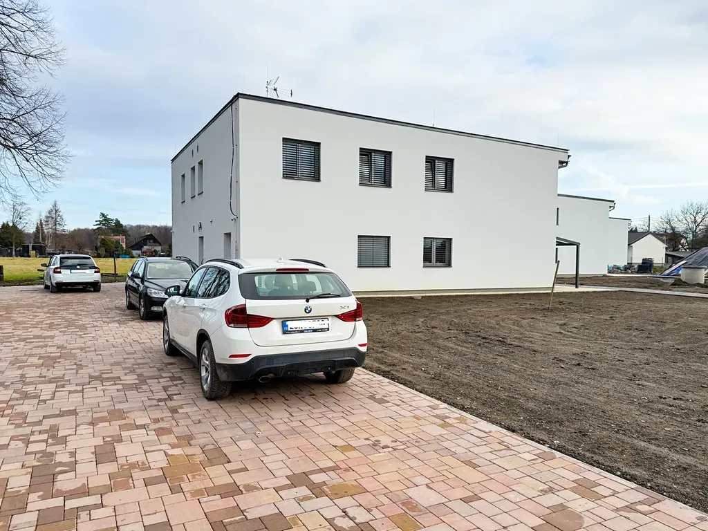 Každý byt v domě má k dispozici dvě parkovací místa, což zajišťuje pohodlné parkování přímo u domu. Dům je vytápěn prostřednictvím tepelného čerpadla, což přináší úsporu nákladů na energie a ekologické řešení. Na jaře bude před domem navíc k dispozici velká zahrada, kde bude mít každý byt svou samostatnou část, která poskytne další prostor pro relaxaci a volnočasové aktivity.