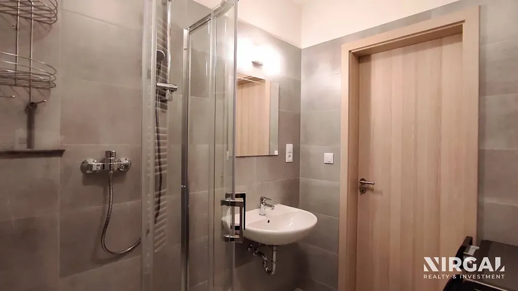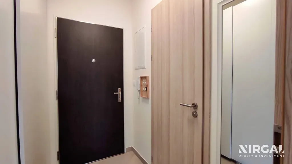 Byt se nachází v 6. patře a je velice vkusně zařízen v moderním “Scandi stylu” v duchu rovných a čistých linií. Skládá se z prostorné předsíně s velkým úložným prostorem a světlého obývacího pokoje s kuchyňským koutem. Velká koupelna se sprchou, toaletou, pračkou a sušičkou. Nová kuchyňská linka vybavená ledničkou a mrazákem, myčkou, sklokeramickou varnou deskou, mikrovlnnou troubou a digestoří. V předsíni a koupelně je na podlahách dlažba.