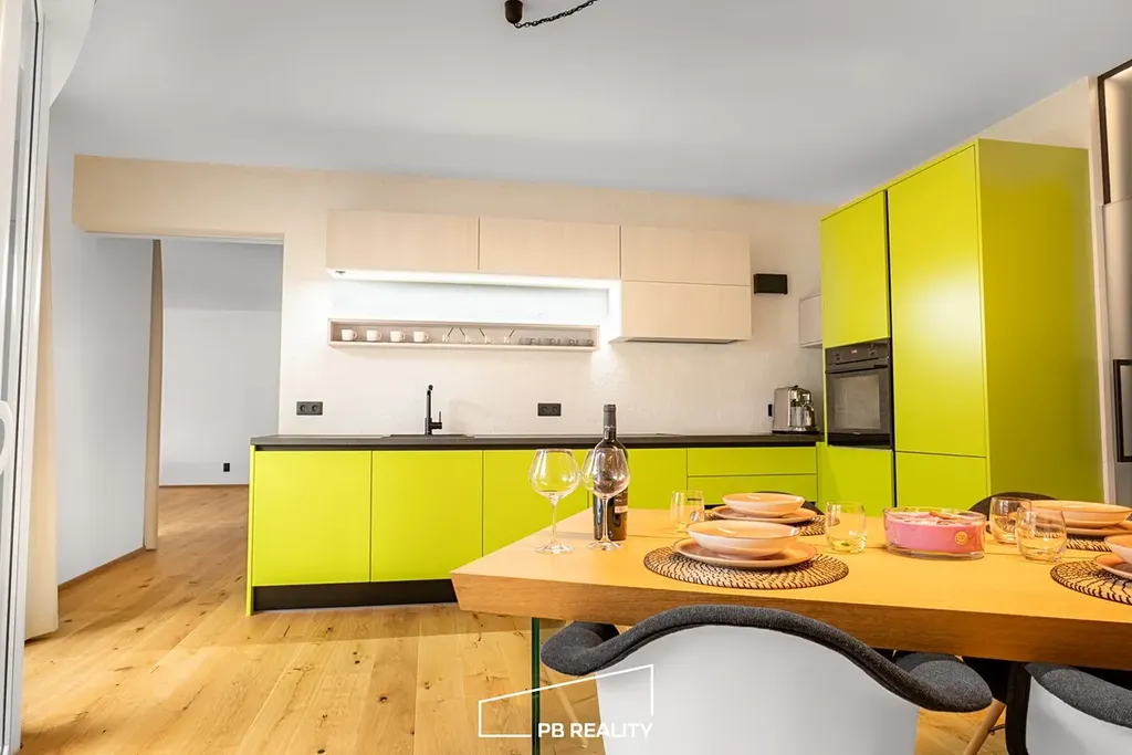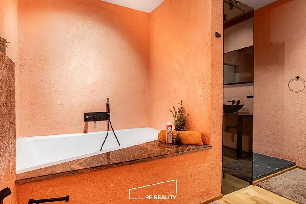 Dřevěná podlaha, podsvícená kuchyňská linka včetně spotřebičů v minimální hodnotě 300 000,-Kč s italskou stěrkou Travertino Romano, prostorná koupelna též kompletně v italské stěrce Travertino Romano s vanou a walk – in sprchou, na zakázku šité black-out závěsy v celém bytě, podsvícená skleněná příčka a zakázková skříňová sestava.