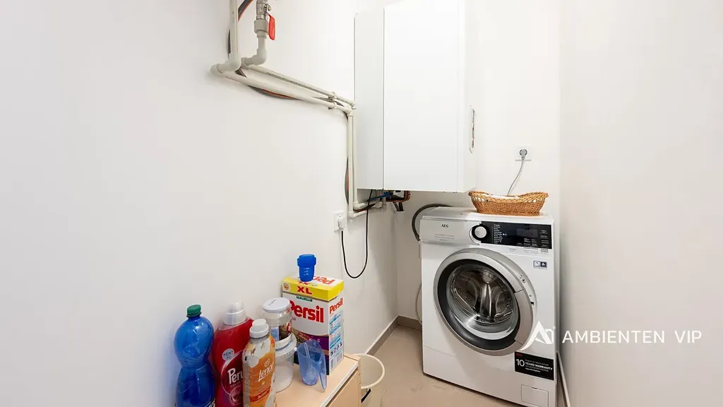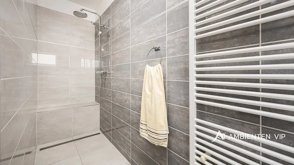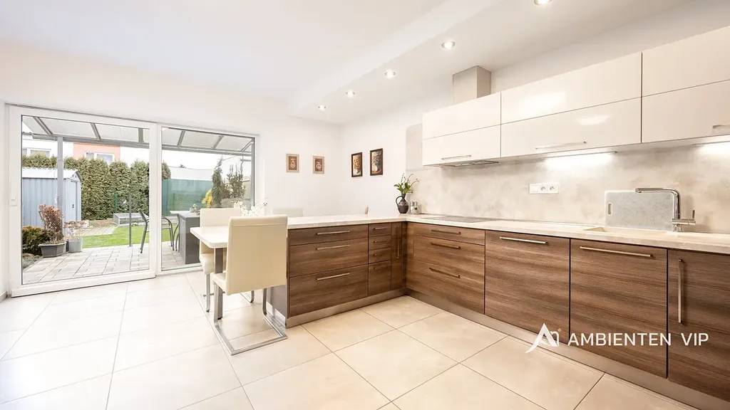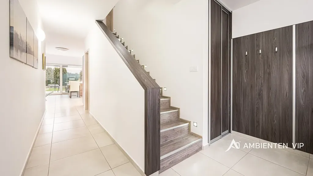 Zádveří domu vás nadchne svojí vzdušností, jelikož je velice prostorné. Spojovací chodba vás zavede přímo do otevřené dispozice kuchyně, jídelny a obývacího pokoje s přímím stupem na terasu a do zahrady. Dominantou obývacího prostoru jsou francouzská okna s výhledem do jižně orientované zahrady odstíněné od sousedních pozemků zelení a stavebními prvky. Na zahradě můžete relaxovat na terase, kterou lze v teplých měsících pojmout jako venkovní jídelnu díky přímému napojení na kuchyňský kout. V blízkosti kuchyně je prakticky umístěna technická místnost s toaletou, umyvadlem a zákoutím pro pračku. V 1 NP se nachází tři ložnice, koupelna a technická místnost. Dvě ložnice mají orientaci směrem do zahrady a jedna směrem do ulice. V technické místnosti se nachází plynový kotel a je zde i příprava pro pračku. Jižní orientace ložnic dodává pokojům dostatek denního světla a uklidňující výhledy do zahrady. V 1 NP je dále šatna na míru s dostatkem úložných prostor. V rámci koupelny se nachází vana, sprcha, umyvadlo a toaleta s bidetovou sprškou. Zdivo nemovitosti je pálená cihla a dům je zateplen. Vytápění domu zajišťuje plynový kotel spolu s tepelným čerpadlem. V přízemí domu je podlahové vytápění po celé podlahové ploše, v patře pak v koupelně. Okna jsou plastová s izolačním trojsklem, do zahrady osazena venkovní elektrickou žaluzií. Celkové měsíční náklady na provoz domu včetně místního internetu činí v průměru 4000,- Kč. Velkou výhodou domu jsou solární panely v záruce, které v letních měsících výrazně snižují náklady na ohřev vody. Nemovitost je v perfektním technickém stavu, prakticky a vkusně zařízena a nevyžaduje žádné nutné investice. K dispozici je dům po dohodě s majiteli.